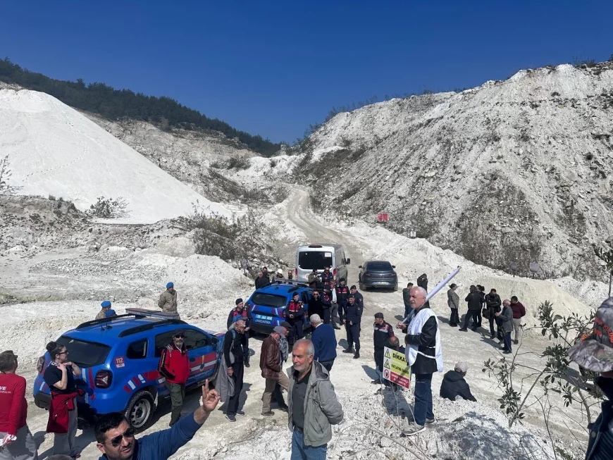5 Bin 823 Dönümlük Alanda Ruhsatsız Faaliyet İddiası ile açılan davanın Bilirkişi Keşfinde “Toprağımıza Sahip Çıkıyoruz” sloganları atıldı, köylüler ve çevre örgütleri maden ocağına sert tepki gösterdi gerğinliği jandarma önledi.