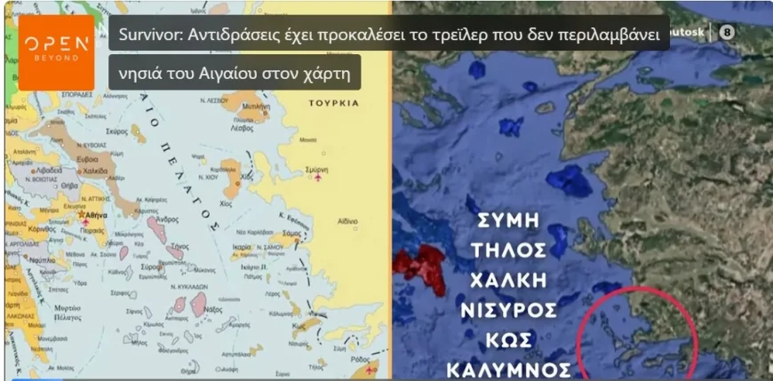 Yunanistan’ın önde gelen haber sitesi www.ethnos.gr tarafından okuyuuclarına duyurulan haberde Türk yapım şirketi Acun Medya tarafından yayınlanan Survivor fragmanında, Ege Denizi haritasının önemli bir hatayla çizildiği açıklandı. Güney Ege’de bulunan ve çoğunluğu Oniki Adalar bölgesinde bulunan Sömbeki (Simi), Tilos, İstanköy (Kos), Halki, İncirli (Nisiros), Kilimli ( Kalymnos) ve İleryoz ( Leros) adalarının mavi renk ile Türkiye’ye ait gibi gösterilmesi ülkeyi ayağa kaldırdı