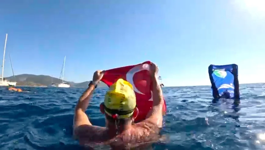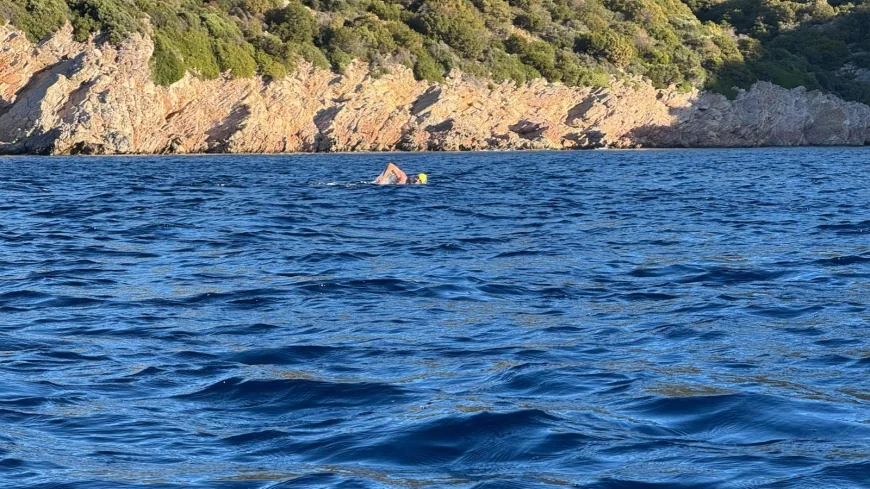 Bodrumlu yüzücü Karaada’nın çevresini 5 saat 33 dakikada yüzerek tamamladı