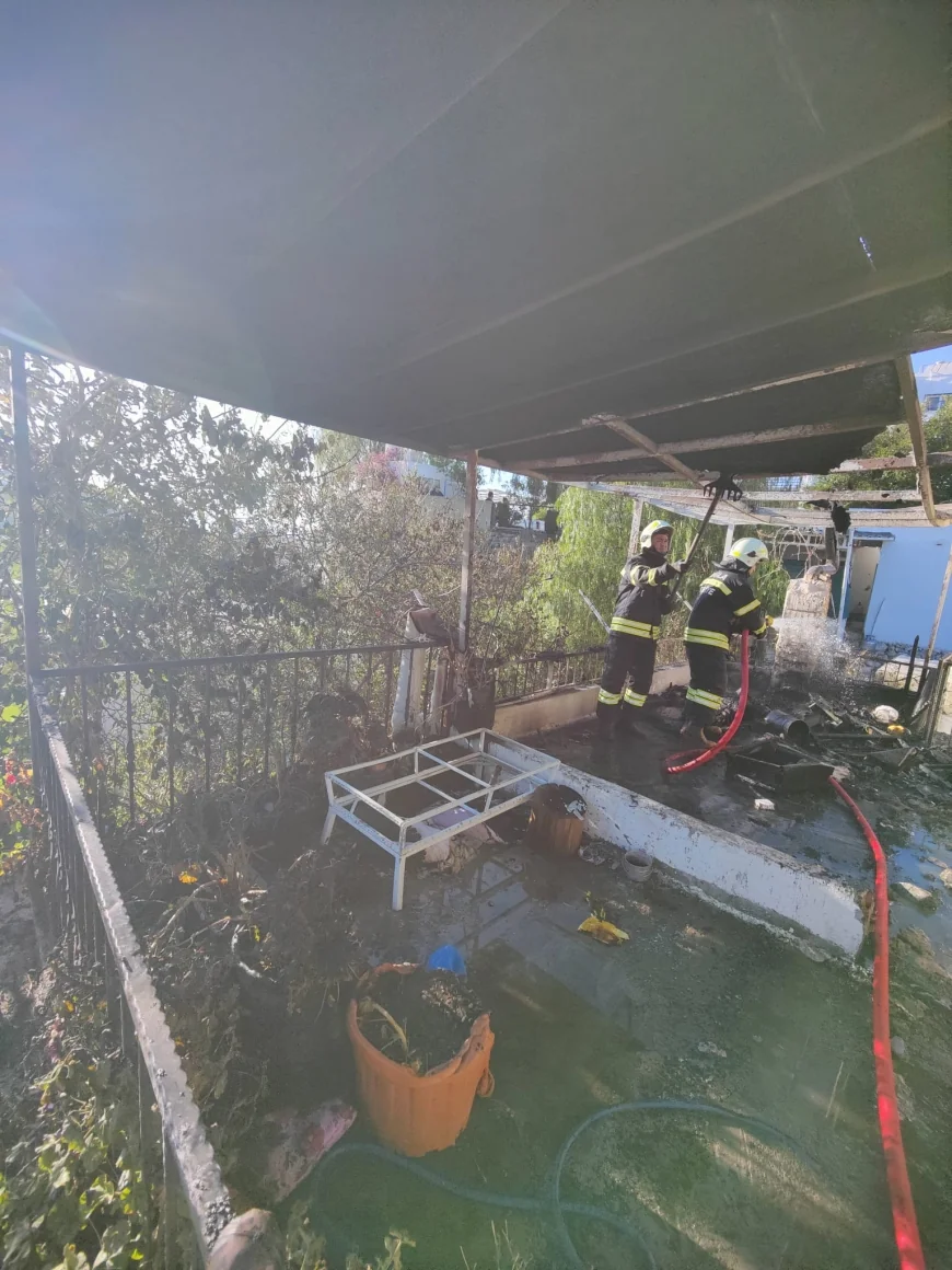 Muğla’nın Bodrum ilçesine bağlı Yalıkavak Mahallesi Geriş mevkiisinde balkonda elektrik kontağından çıkan yangın evi kül ediyordu.