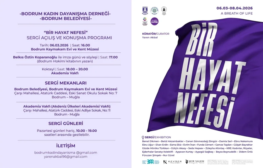 Sanatçılar: Benal Dikmen, Betül Akzambaklar, Canan Sönmezdağ Zöngür, Damla Sari, Ebru Nakamura, Ebru Uğur, Elvan Erdin, Esma Ekiz, Evrim İnan, Funda Cömert, Gamze Taşdan, Gülşah Bayraktar, Gözde Mimiko Türkkan, Gülçin Aksoy, Seda Hepsev, Züleyha Altıntaş ve KRE; Kadınlar, Rüyalar, Ejderhalar Sanatçı Kolektifi: Ayşecan Kurtay, Ayşegül Sağbaş, Beyza Boynudelik, Didem Ünlü, Füruzan Şimşek, Nur Gürel. Sergi Muğla Büyükşehir Belediyesi Kadın ve Aile Hizmetleri Dairesi, Akdeniz Ülkeleri Araştırmaları Vakfı (Akademia), Bodrum Deniz Müzesi, Mor Salkım Bağları ve Kevser Taliana desteğiyle gerçekleşiyor. Açılış: 06 Mart 2026 16:00 Bodrum Belediyesi, Bodrum Kaymakam Evi ve Kent Müzesi’nde gerçekleştirilecek açılış konuşmalarının ardından Bodrum Hâkimi kitabının yazarı Belkıs Öztin Koparanoğlu ile imza günü ve söyleşi. Kokteyl: 18:00- 20:00 Akademia Vakfı (Eski Adliye Binası) Adres: Bodrum Belediyesi Bodrum Kaymakam Evi ve Kent Müzesi.