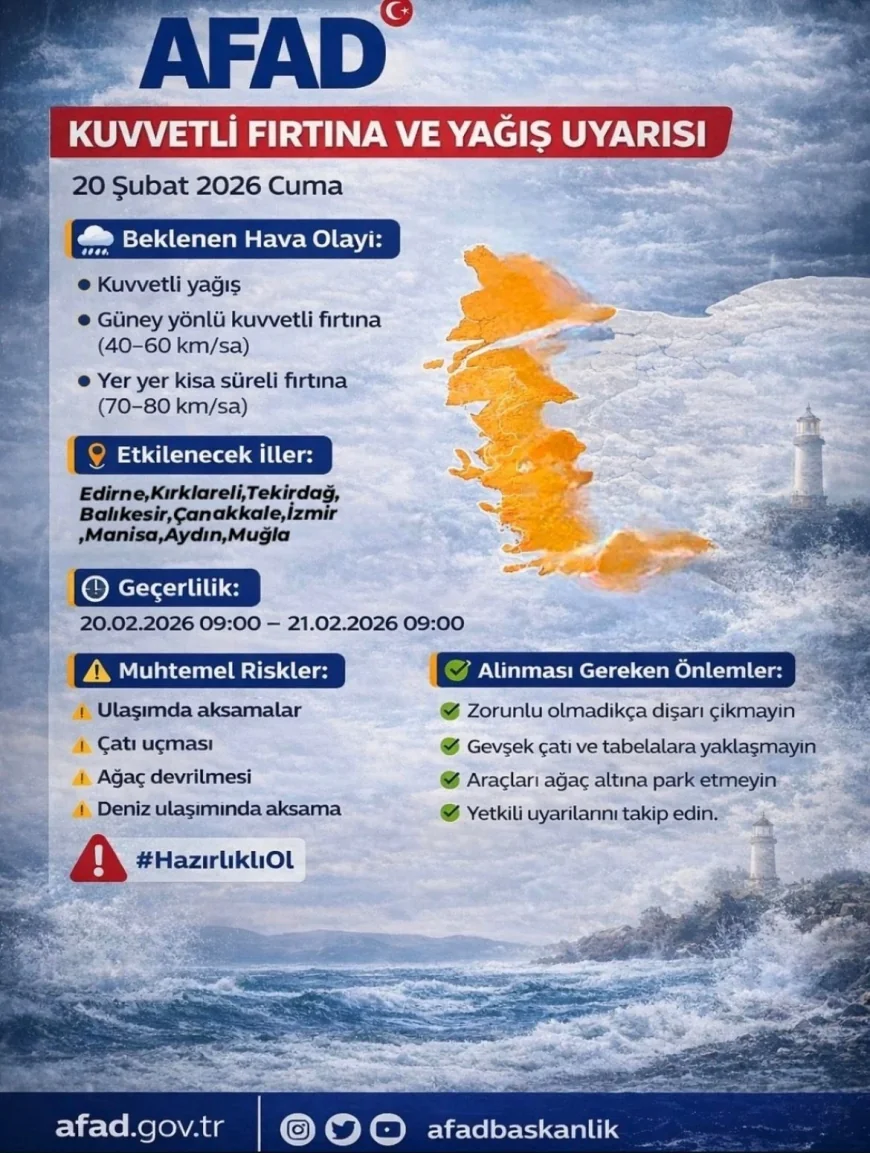 Afet ve Acil Durum Yönetimi Başkanlığı (AFAD), 20 Şubat 2026 Cuma günü için kuvvetli fırtına ve yağış uyarısında bulundu. Yapılan açıklamada, özellikle Ege ve Marmara’nın bazı illerinde etkili olması beklenen olumsuz hava koşullarına karşı vatandaşların tedbirli olması istendi.
