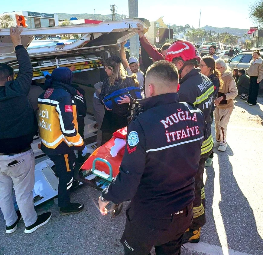 Bodrum’da ambulans kaza yaptı devrildi, hastayı itfaiye ekipleri güçlükle çıkardı