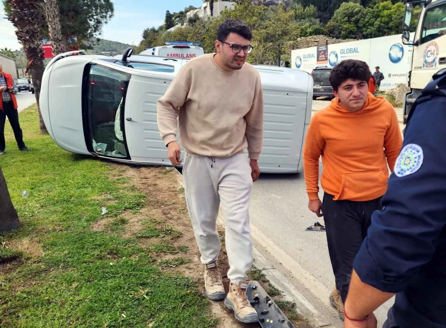 Muğla’nın Bodrum ilçesinde aniden caddeye çıkan araç minibüs ile çarpıştı . Takla atan minibüsteki iki genç kazayı şans eseri burunları bile kanamadan atlattı.
