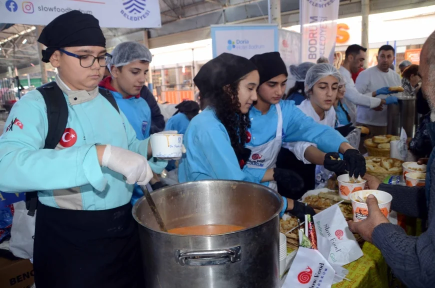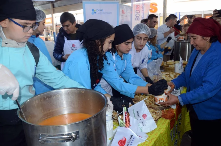 Yerel üreticiye, doğaya ve toprağın bereketine dikkat çekmeyi amaçlayan etkinlikte Turgutreis Turizm Meslek Lisesi Aşçılık Bölümü öğrencileri kazanlarla tarhana çorbası ve yanında gemici ekmeği peksimet dağıttı.