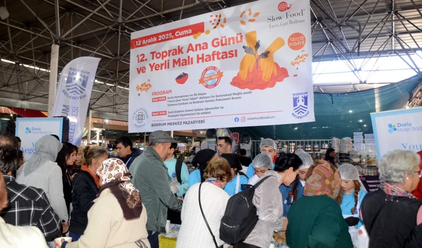 Muğla’nın Bodrum ilçesindeki pazar yerinde bugün Slow Food Yaveş Gari Bodrum Birliği tarafından 12. kez düzenlenen Toprak Ana Günü’nde, yörenin değerlerinden tarhana çorbası ve gemici ekmeği olarak bilinen peksimet dağıtıldı.
