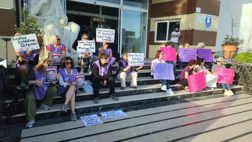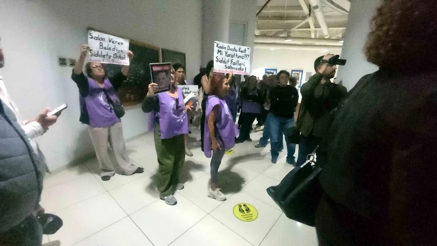 Ellerinde Kadın dostu kent mi yarattınız şiddet failleri sahnede, Failin Seyircisi Olma Mağdurun Sesi Ol, Ozan Güven Komik Değilsin, Şiddete alkış yok, Ozan Güven Şiddet Failidir, Salon Veren Belediye Şiddete Ortaktır dövizleri ile merdivenlere oturarak protesto gösterisi yaptılar.