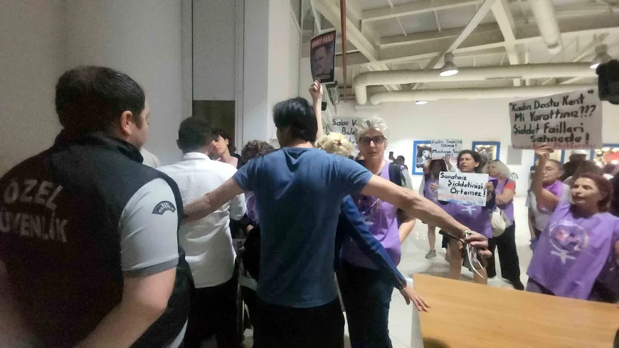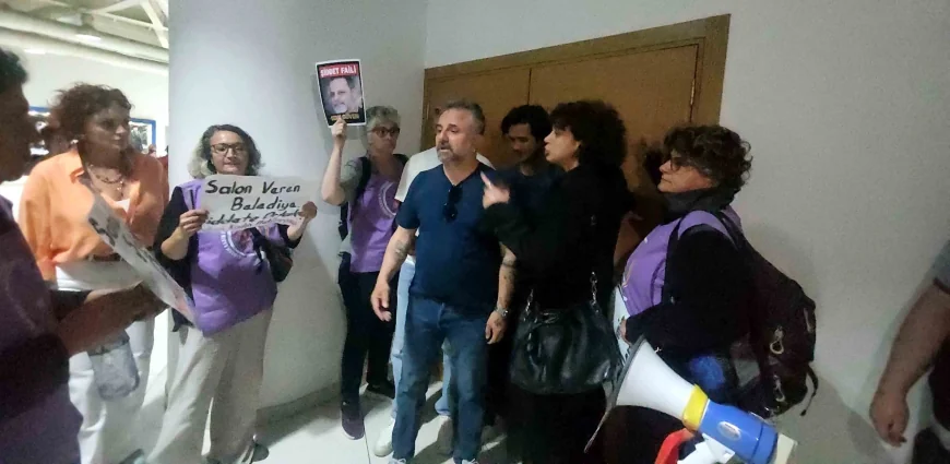 Oyun başladıktan sonra kültür merkezine girerek sahneye gitmek isteyen kadınlarla belediyenin özel güvenlik personeli ve Ozan Güven’in korumaları arasında gergin anlar yaşandı.
