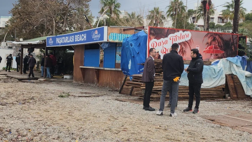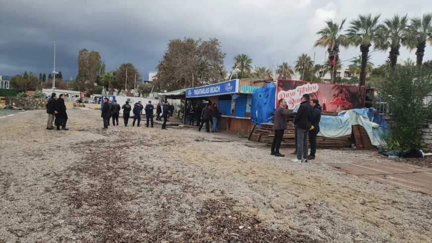 Muğla’nın Bodrum ilçesinde turistik halk plajlarındaki büfe, restoran ve otellerin uzantıları olan kaçak yapılar bu sabahtan itibaren kaldırılmaya başladı.