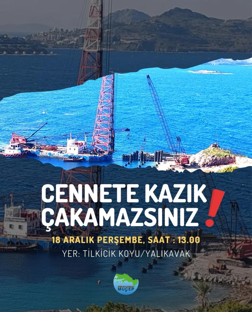 "Muğla Çevre Platformu (MUÇEP), 18 Aralık Perşembe Günü Tilkicik Koyu/Yalıkavak’ta Saat 13.00’de, deniz içine kazıklar çakmak suretiyle hukuk dışı devam eden inşaat çalışmalarını protesto eden bir basın açıklaması yapacak.