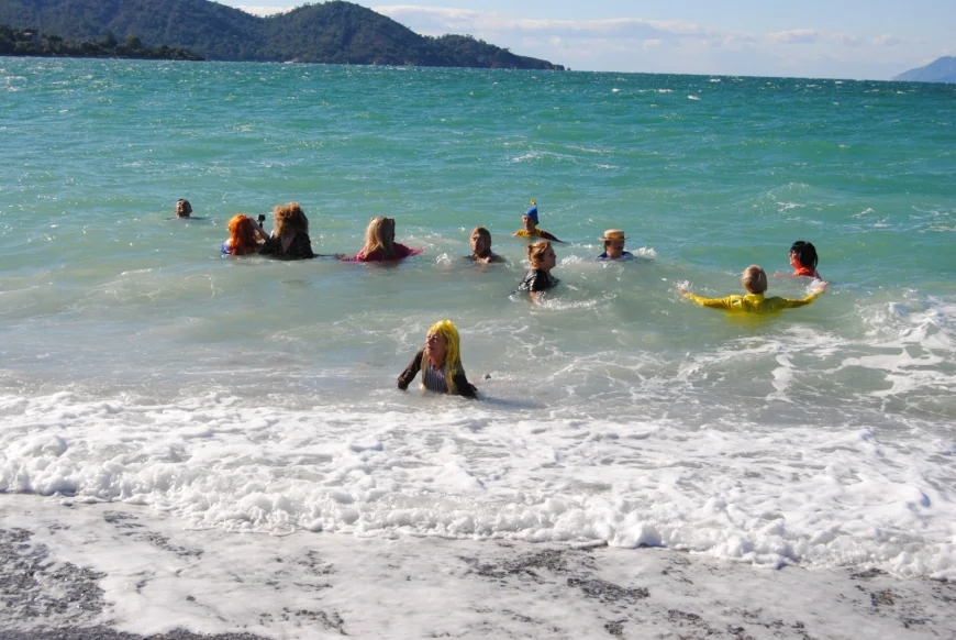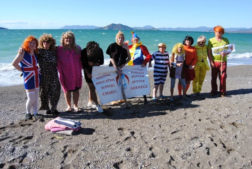 Muğla'nın Fethiye ilçesinde yeni yılın ilk günü düzenlenen etkinlikte, bir grup yabancı uyruklu vatandaş yardıma muhtaç çocuklar ve sokak hayvanları için değişik kostümlerle denize girdiler.