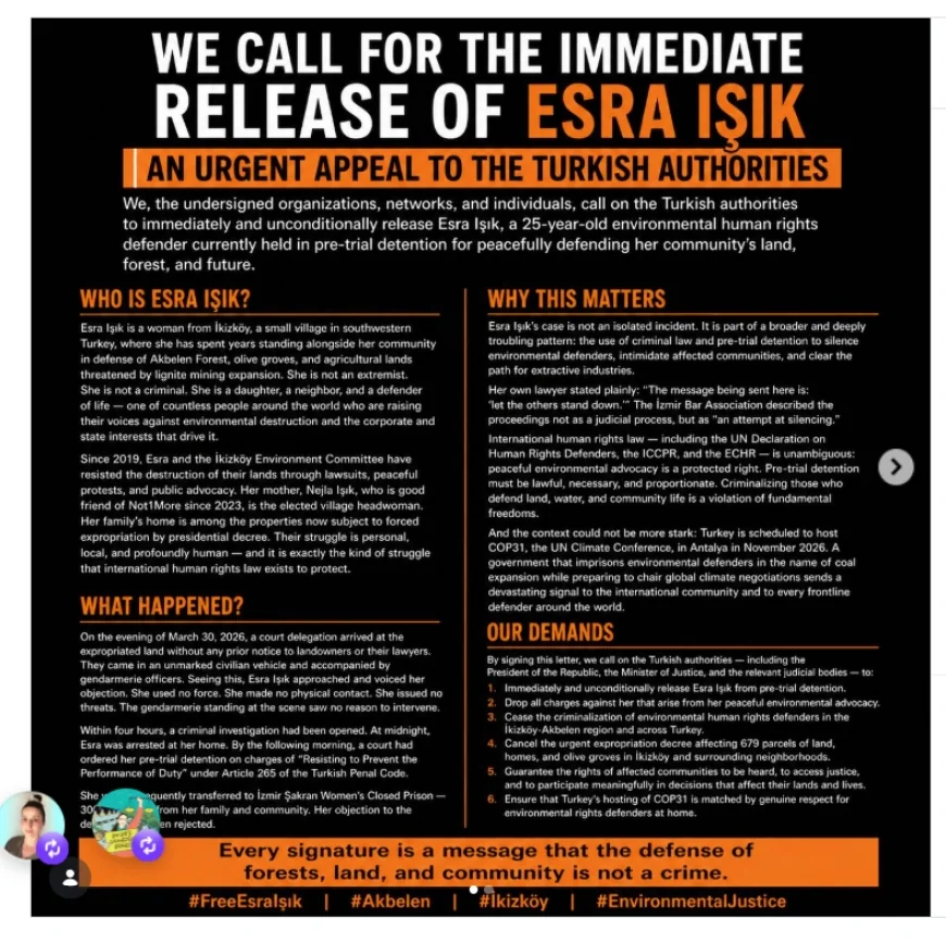 “30 Mart 2026'da çevreci Esra Işık, protestolar sırasında gözaltına alındı ve tutuklandı. Türkiye'nin güneybatısındaki Muğla'da bulunan Akbelen Ormanı'ndaki kömür madenciliği genişlemesiyle bağlantılı acil kamulaştırma işlemlerine karşı protesto gösterisi düzenliyordu.