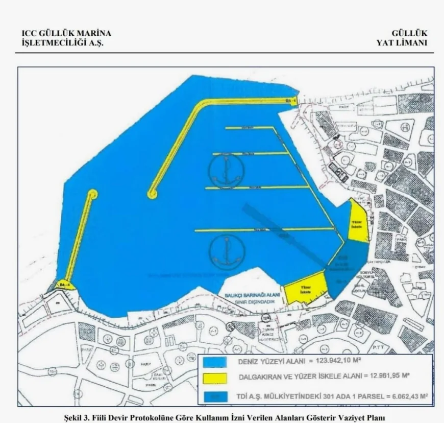 “1981 yılında işletmeye alınan Güllük İskelesi, 2006 yılına kadar, bölgeden çıkarılan feldspat madeni ihraç eden firmalara yükleme-boşaltma, pilotaj, tartı, atık ve tatlı su satışı hizmetleri vermiştir. Özelleştirme İdaresi Başkanlığı (ÖİB) tarafından Yat Limanına dönüştürülmesine ilişkin olarak Muğla İli, Milas İlçesi, Güllük Beldesi, Güllük Yat Limanı 1/5.000 ölçekli Nazım İmar Planı Değişikliği ile 1/1.000 Ölçekli Uygulama İmar Planı Değişikliği; Özelleştirme Yüksek Kurulu’nun 27.01.2014 tarih ve 2014/2 sayılı kararı ile onaylanmış ve 30.01.2014 tarih ve 28898 sayılı Resmi Gazete ‘de yayımlanarak yürürlüğe girmiştir. Proje Alanına ait 23.10.1996 tarihli tapuda alanın parsel numarası 618 ve alanı 5.975 m²’dir. 27.08.2020 tarihli tapu kaydında ise tapu alanının ada/parsel numarası 301/1 ve alanı 6.062,43 m²’dir. Planlanan Güllük Yat Limanı projesi ile ilgili olarak 136.904,05 m2’lik (12.961,95 m2 kara alanı + 123.942,10 m2 deniz alanı) deniz ve kara alanı için 15.06.2015 tarihinde Milli Emlak ve TDİ arasında 49 yıllığına Kullanma İzni Sözleşmesi imzalanmıştır. 20.10.2020 tarihinde ise Kullanma İzni Sözleşmesi tadilatı gerçekleştirilmiştir” ifadelerini kullandı.