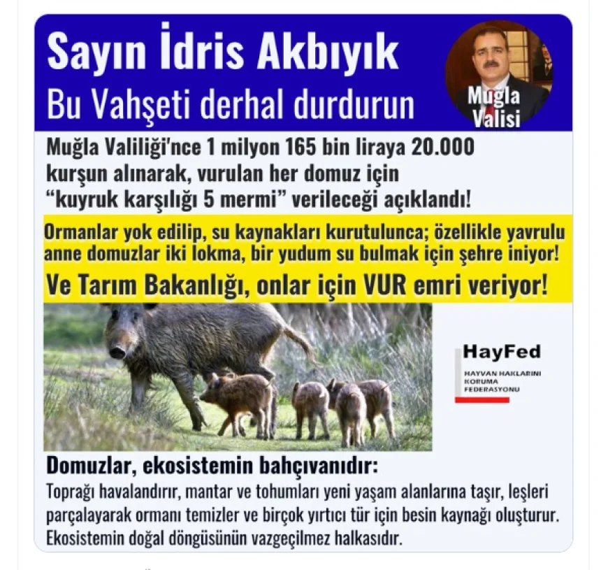 “Muğla Valisi Sayın İdris Akbıyık, bu VAHŞİ UYGULAMAYI derhal durdurunuz. Muğla Valiliği'nce 1 milyon 165 bin liraya 20.000 kurşun alınarak, vurulan her domuz için “kuyruk karşılığı 5 mermi” verileceği açıklandı! Ormanlar yok edilip, su kaynakları kurutulunca; özellikle yavrulu anne domuzlar iki lokma, bir yudum su bulmak için şehre iniyor! Ve Tarım Bakanlığı, onlar için VUR emri veriyor! Domuzlar, ekosistemin bahçıvanıdır: Toprağı havalandırır, mantar ve tohumları yeni yaşam alanlarına taşır, leşleri parçalayarak ormanı temizler ve birçok yırtıcı tür için besin kaynağı oluşturur. Ekosistemin doğal döngüsünün vazgeçilmez halkasıdır. Sulak alanları kurutup yaşam alanlarını yok ettiğiniz için şehre inen hayvanların vurulması amacıyla “kuyruk karşılığı mermi” dağıtılması, yönetim zafiyetinin ötesinde vahşi bir uygulamadır. Derhal durdurun”
