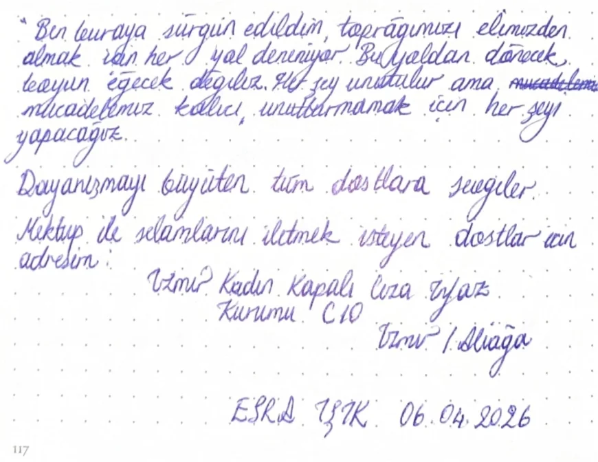 Esra Işıkı ise mektubunda “Ben buraya sürgün edildim, toprağımızı elimizden almak için her yol deneniyor. Bu yoldan dönecek, boyun eğecek değiliz. Her şey unutulur ama mücadelemiz kalıcı, unutturmamak için her şeyi yapacağız...