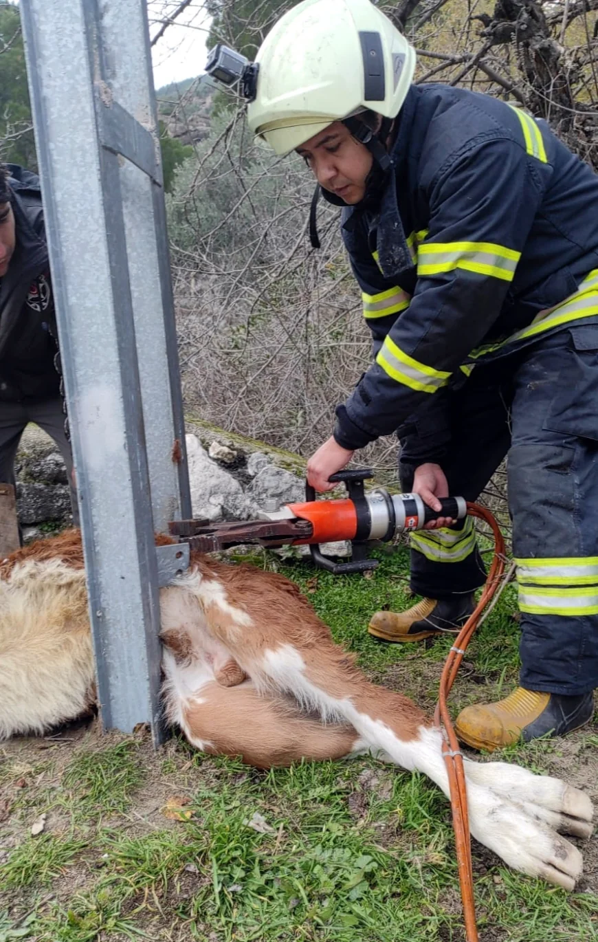 Elektrik direğine sıkışan buzağı itfaiyenin operasyonu ile kurtarıldı. Sahibi ise buzağının başında gözyaşı döktü.
