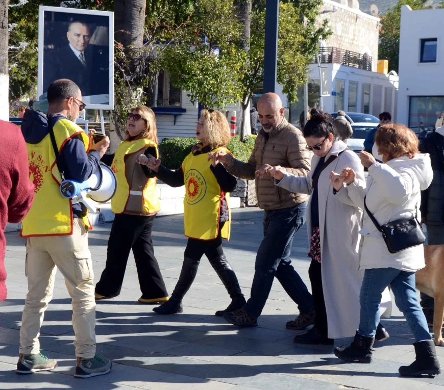 Muğla’nın Bodrum ilçesinde ek zam talep eden Kamu Emekçileri Sendikası (KESK) üyeleri iş bıraktı Belediye Meydanı’Nda eylem yaptı, halay çekti.