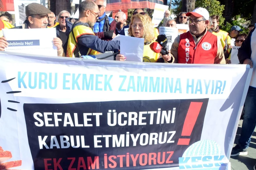 “Kuru Ekmek Zammına Hayır – Sefalet Ücretini Kabul Etmiyoruz – Ek Zam İstiyoruz” yazılı pankartlar açan eylemciler, Çetelere Deeğil Emekçiye Bütçe, Sefalete Teslim Olmayaacğız sloganları attı.