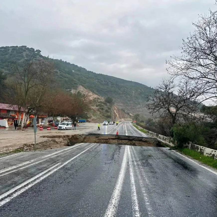 Aydın sınırına yaklaşık 500 metre kala Selçuk–Ortaklar Karayolu’nda yoğun yağış sonrası yolun bir bölümünde ciddi çökme meydana geldi. Çökme noktasında uzun süre herhangi bir uyarı levhası, ikaz lambası ya da güvenlik şeridi bulunmadığı öğrenildi.