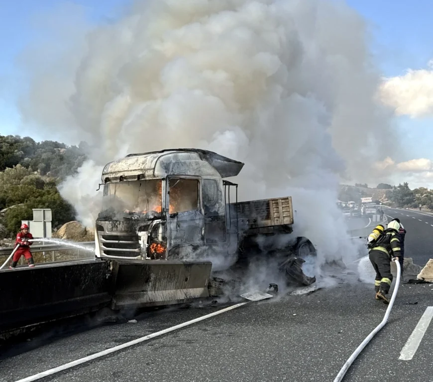 Muğla’nın Yatağan ilçesi ile Aydın’ın Çine ilçesi arasındaki karayolunda. seyir halindeki bir TIR, direksiyon hakimiyetinin kaybolması sonucu yol ortasındaki beton bariyere çarptı. Çarpmanın etkisiyle araçta hızla yangın çıktı. TIR Şogörü T.S. sürücü mahallinden atlayarak kurtulabildi.