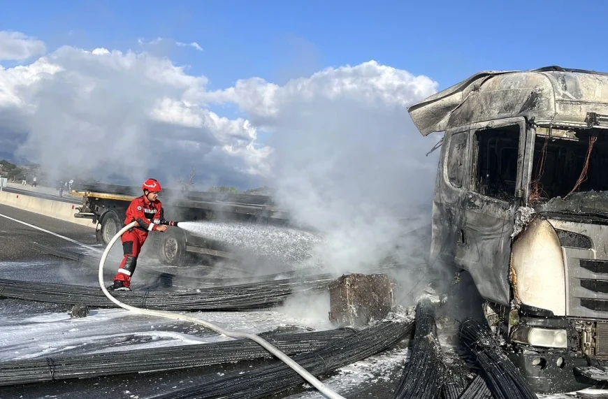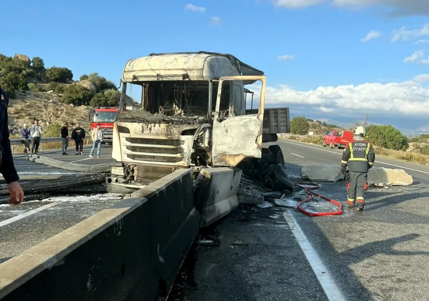 Muğla’nın Yatağan ilçesi ile Aydın’ın Çine ilçesi arasındaki karayolunda meydana gelen olayda bariyerlere çarpan TIR alev aldı, yandı. TOR şoförü olay anında araçtan atlayarak kendini kurtarabildi.