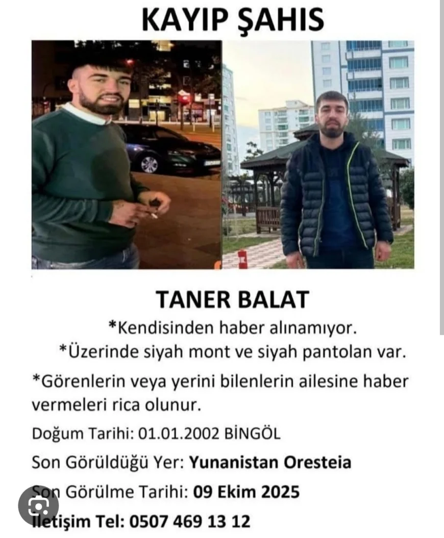 Bingöllü 23 yaşındaki kayıp Taner Balat Yunanistan’ın Batı Trakya’daki Meriç (EVros) ilinde ilanlarla aranıyor