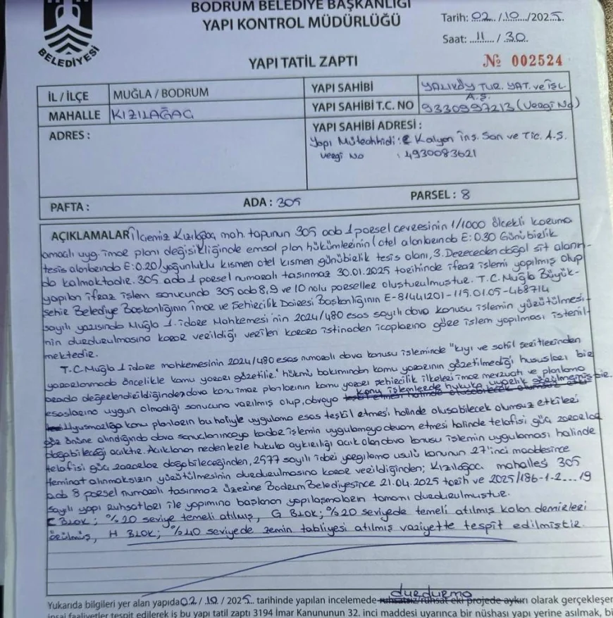 Gazeteci Mustafa Gündoğ’un imar planlarının yürütmeyi durdurma kararının verilmesi ile ilgili mahkeme kararına ulaşmasının ardından Bodrum Belediyesi’nin bugün Kalyon İnşaat ve Yapı Sanayi A.Ş. adına tutanak düzenleyerek inşaatın durdurulduğunu açıklaması Bodrumluların tepkisini çekti “Bodrumlular 20 gün önce verilen mahkeme kararını uygulamak için Bodrum Belediyesi neyi bekledi” diye sordular.