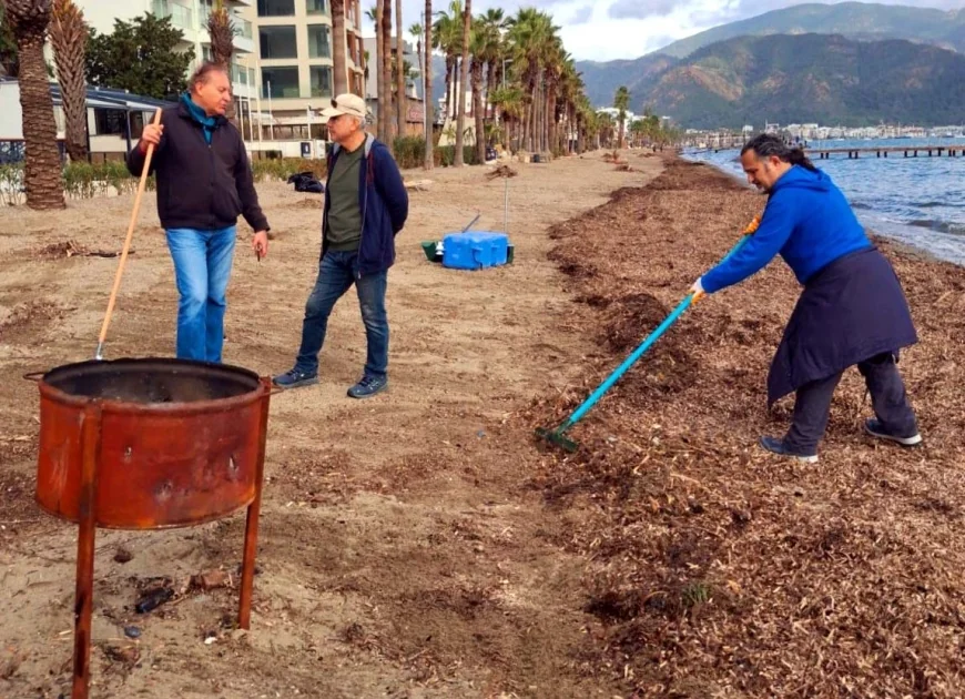 Doğa gönüllüleri yaklaşık 3 kilometrelik sahil şeridinde tırmıklarla, dalgaların kumsala getirdiği ve “erişte” olarak adlandırılan atıklar düzgün hatlar halinde toplandı. Böylece temizlik ekiplerinin daha sonra kepçelerle bu atıkları kolayca alabilmesi sağlandı.