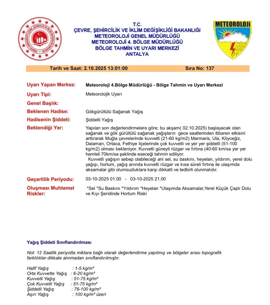 Yapılan son değerlendirmelere göre; bu akşam (02.10.2025) başlayacak olan sağanak ve gök gürültülü sağanak yağışların gece saatlerinden itibaren etkisini arttırarak Muğla çevrelerinde kuvvetli (21-60 kg/m2), Marmaris, Ula, Köyceğiz, Dalaman, Ortaca, Fethiye ilçelerinde çok kuvvetli ve yer yer şiddetli (51-100 kg/m2) olması bekleniyor. Kuvvetli güneyli rüzgar ve fırtına (40-60 km/sa, yer yer hamleli 70 km/sa) şeklinde eseceği tahmin ediliyor.