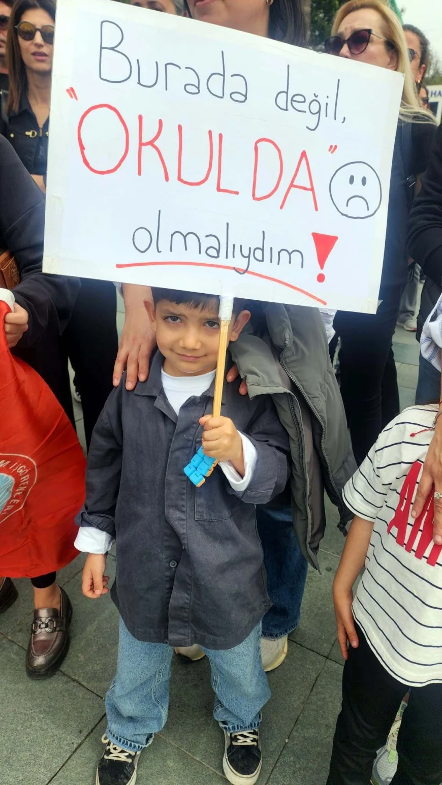 Eyleme öğretmen annesi ile birlikte katılan 7 yaşındaki bir öğrencinin taşıdığı “Burada Değil Okulda Olmalıydım” dövizi dikkat çekti.