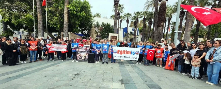 Muğla’nın Bodrum ilçesinde bugün öğle saatlerinde Belediye Meydanı Atatürk Anıtı önünde toplanan yaklaşık 200 öğretmen “Okullar kan gölüne dönüyor, sorumlular hâlâ izliyor” eylem ve basın açıklaması yaptı.