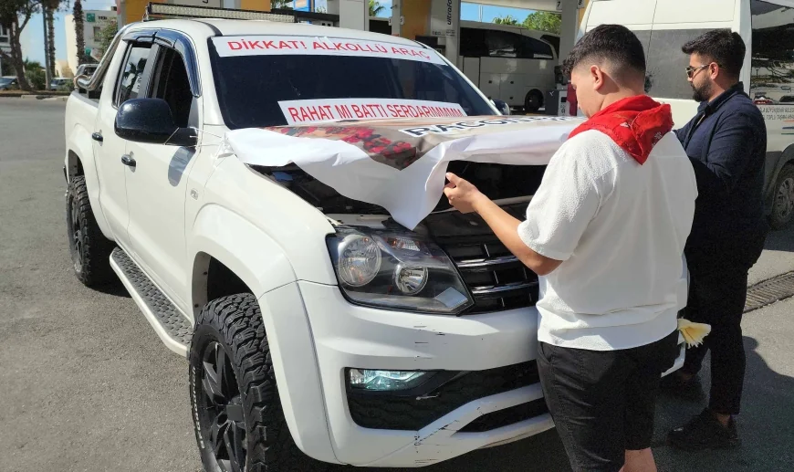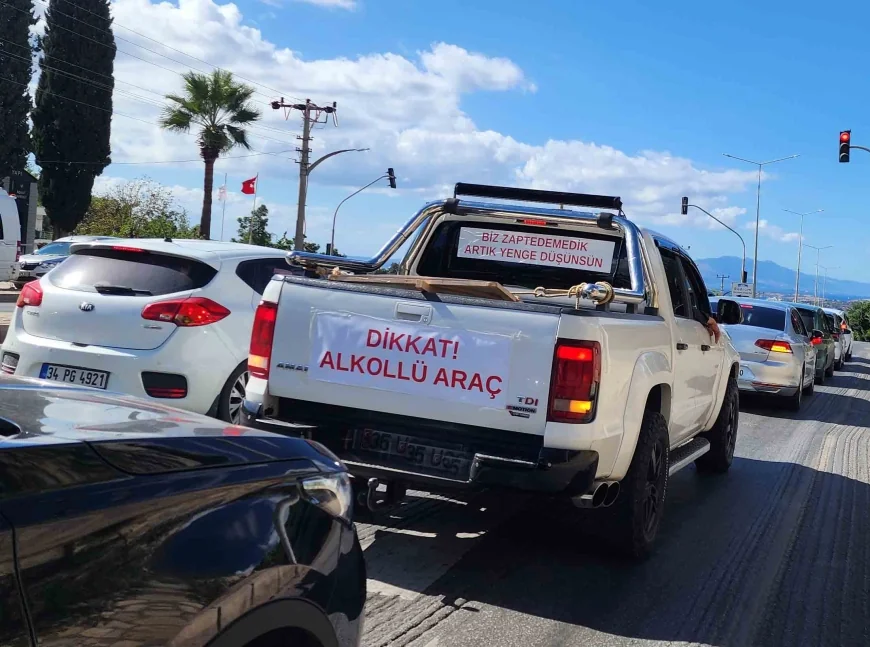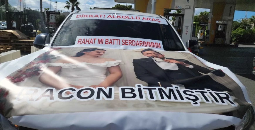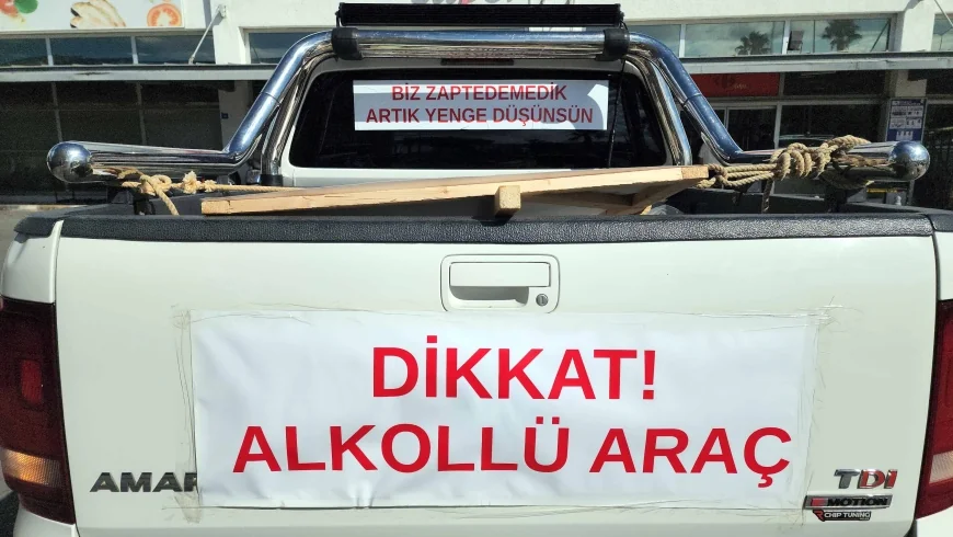 Muğla’nın Bodrum ilçesinde yeni evlenecek gencin yapılacak düğünü öncesinde geleneksel ağırlık taşımak için hazırlanan kamyonet arkasında yazılı “Dikkat Alkollü Araç” ve “Biz Zaptedemedik Artık Yenge Düşünsün” pankartlarıyla Bodrum trafiğine çıkınca ilginç görüntülere neden oldu.