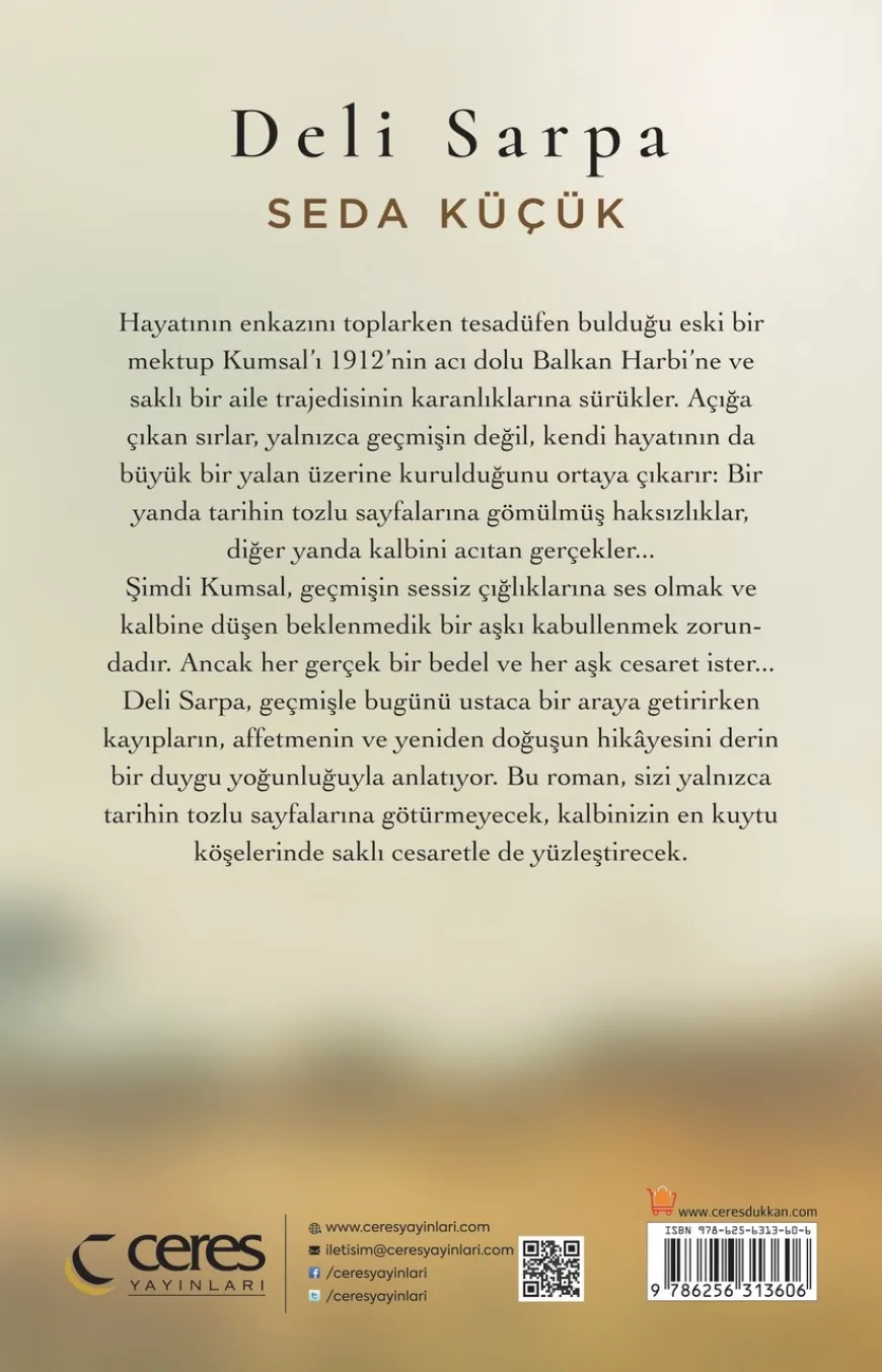Hayatının enkazını toplarken tesadüfen bulduğu eski bir mektup Kumsal’ı 1912’nin acı dolu Balkan Harbi’ne ve saklı bir aile trajedisinin karanlıklarına sürükler. Açığa çıkan sırlar, yalnızca geçmişin değil, kendi hayatının da büyük bir yalan üzerine kurulduğunu ortaya çıkarır: Bir yanda tarihin tozlu sayfalarına gömülmüş haksızlıklar, diğer yanda kalbini acıtan gerçekler... Şimdi Kumsal, geçmişin sessiz çığlıklarına ses olmak ve kalbine düşen beklenmedik bir aşkı kabullenmek zorundadır. Ancak her gerçek bir bedel ve her aşk cesaret ister... Deli Sarpa, geçmişle bugünü ustaca bir araya getirirken kayıpların, affetmenin ve yeniden doğuşun hikâyesini derin bir duygu yoğunluğuyla anlatıyor. Bu roman, sizi yalnızca tarihin tozlu sayfalarına götürmeyecek, kalbinizin en kuytu köşelerinde saklı cesaretle de yüzleştirecek.