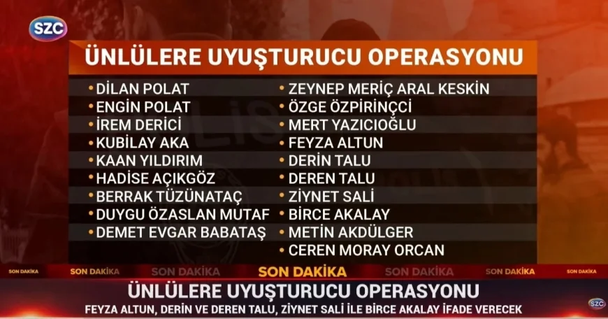İstanbul Cumhuriyet Başsavcılığı Kaçakçılık, Narkotik ve Ekonomik Suçlar Soruşturma Bürosu'nun yürüttüğü soruşturma kapsamında; haklarında uyuşturucu veya uyarıcı madde kullanmak suçundan soruşturma başlatılan ve kamuoyunca tanınan kişilere yönelik bir operasyon düzenlendi.