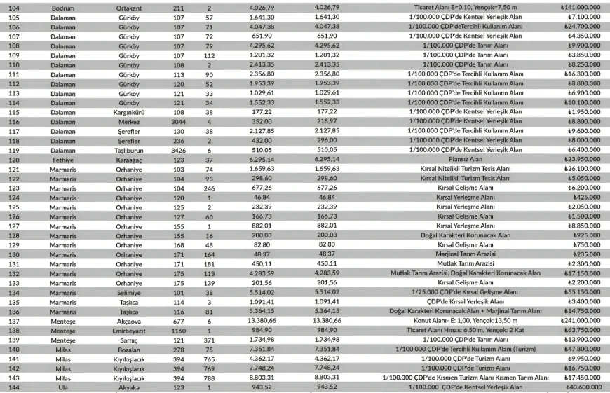 Satışa konu arsaların Bodrum, Dalaman, Fethiye, Marmaris, Menteşe, Milas ve Ula ilçelerinde yer alıyor. Özellikle Marmaris’in Orhaniye, Selimiye ve Taşlıca mahallelerindeki taşınmazlar, doğal güzellikleri, sakin yapısı ve yüksek turizm potansiyeliyle öne çıkıyor.