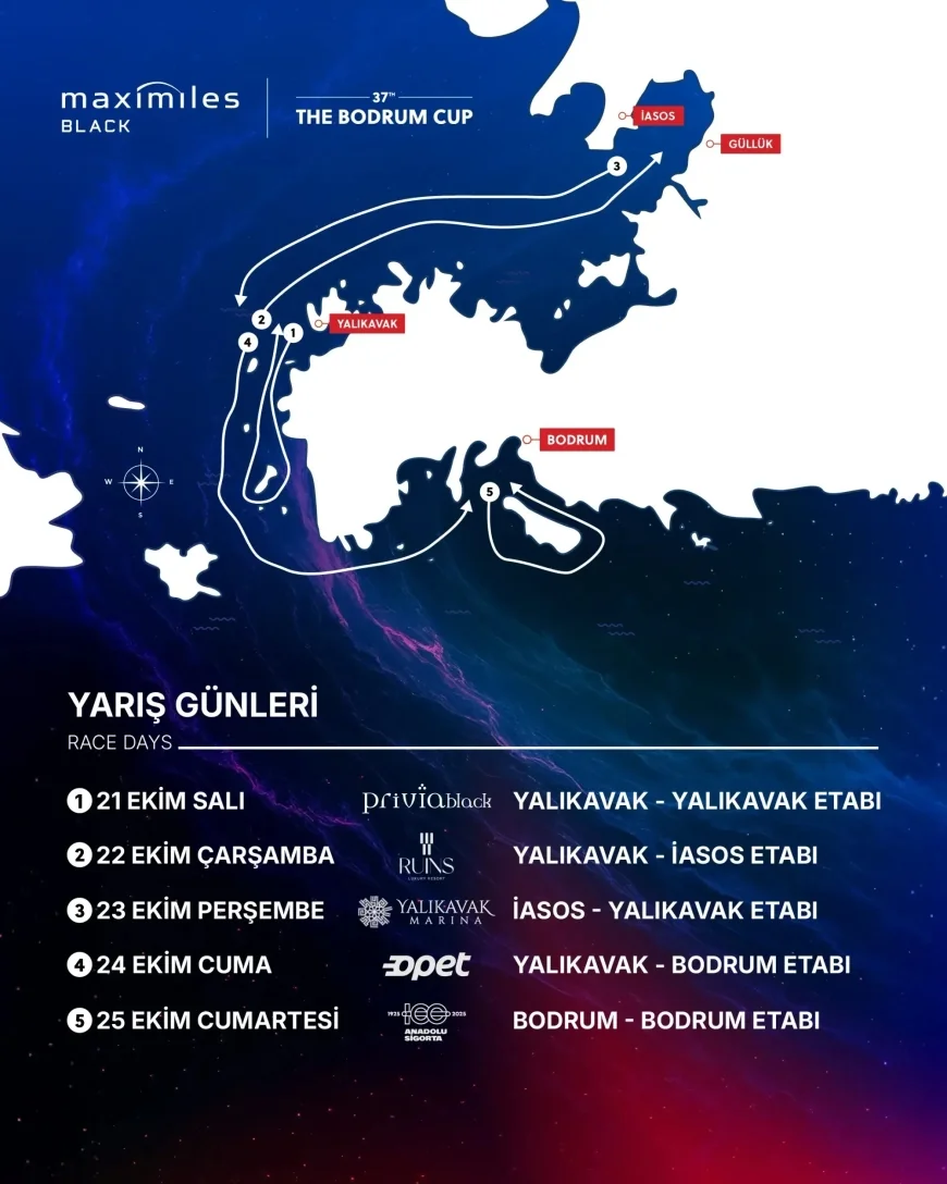 The Bodrum Cup yarışmaları 21 Akim Salı günü Yalıkavak- Yalıkavak etabı ile başlayarak , Yalıkavak – İasos, İasos- Yalıkavak, Yalıkavak- Bodrum etabı ile devam ederek 25 ekim günü Bodrum- Bodrum etabı ile sona erecek. Yelkenciler 5 günde yaklaşık 110 mil yol kat edecek.