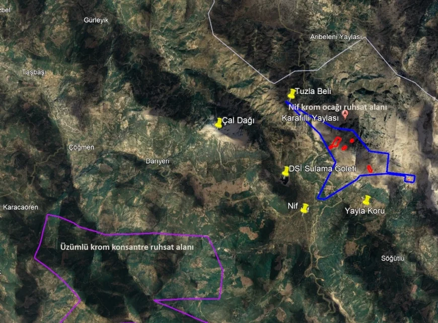 Proje dosyasına göre, krom madeni 836,77 hektarlık ruhsat sahasının 21,48 hektarlık bölümünde planlanıyor. Alan tamamen orman vasfındaki bölgede yer alıyor. Maden sahasının çevresinde Nif Çeşmesi’nin kaynağı, Üzümlü Havzası ve Yayla Koru su sistemleri bulunuyor. Projede patlatmalı açık işletme ve yeraltı üretimi planlandı. Yıllık toplam üretim kapasitesi ise 300 bin ton olarak belirtildi.